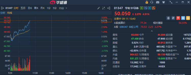 華盛資訊9月11日訊,港股半導體板塊逆勢走強,英諾賽科漲超5%,華虹半導體漲超4%,中芯國際、上海復旦漲近3%。