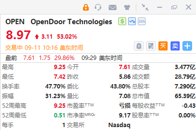華盛資訊9月11日訊,週四美股早盤,“網紅股”Opendoor盤中暴漲超50%,自6月份觸及歷史低點以來,目前該股已經上漲了14倍多新CEO任命及創始人迴歸提振市場信心。
