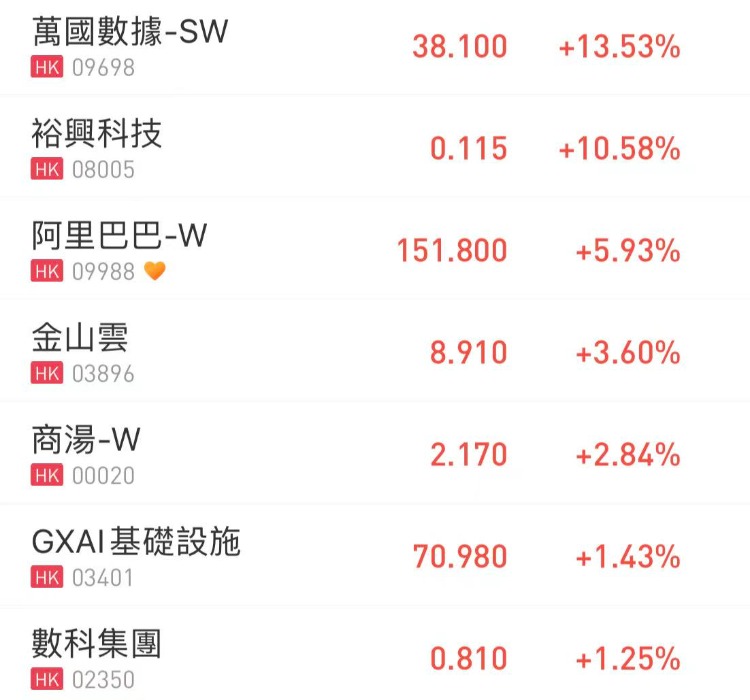華盛資訊9月12日訊,港股數據中心概念股集體拉昇,萬國數據-SW漲超13%,阿里巴巴漲近6%,金山雲漲近4%,商湯-W漲近3%,數科集團漲超1%。