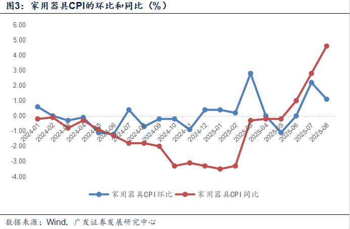 CPI非食品部分環比弱於7月,我們理解主要來自耐用消費品的價格節奏。通信工具(手機)7月環比0.3%,屬於年內首次價格環比正增長;家用器具7月環比2.2%,均是7月非食品價格的主要拉動項,其中可能包含補貼節奏階段性放緩的影響,第三批“以舊換新”國補資金7月底下達;也包含着前期銅等原材料成本上漲有關,在度過促銷期後開始顯現。8月在新的價格基礎上,環比放緩屬於正常。即便如此,家用器具環比依然有1.1%,同比進一步上行至4.6%。