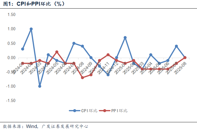 8月CPI環比零增長(前值0.4%),PPI環比零增長(前值-0.2%)。