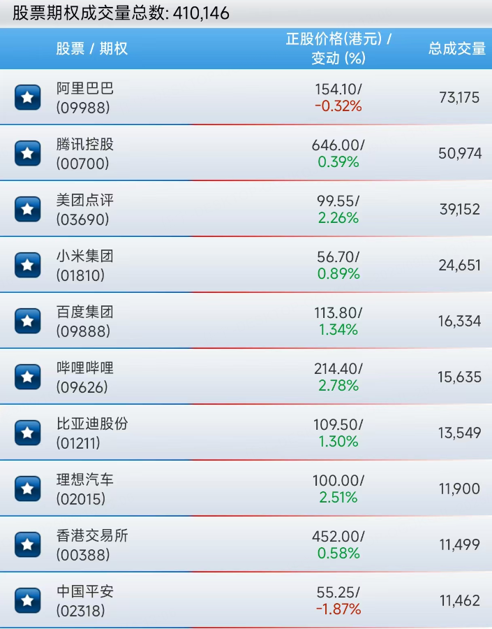 港股期權半日成交410146張。其中,阿里巴巴連續第二日位於榜首,期權成交73175張。騰訊、美團、小米、百度等主要科技股緊隨其後。