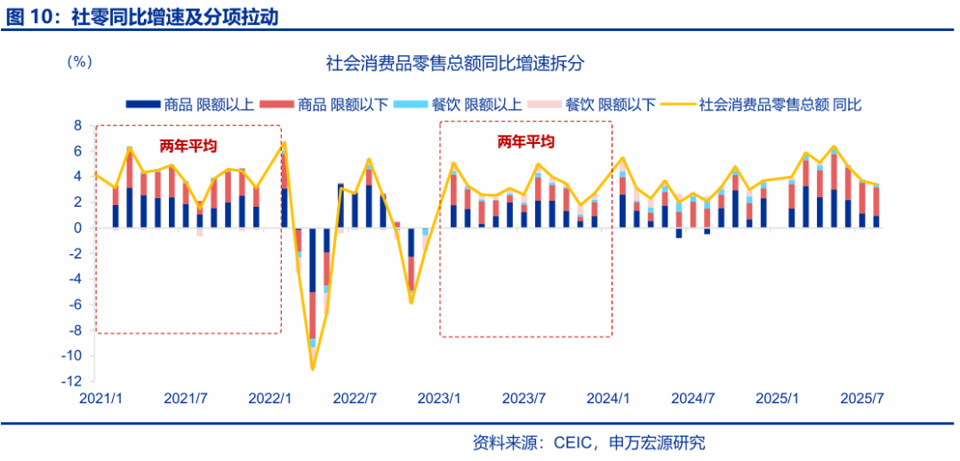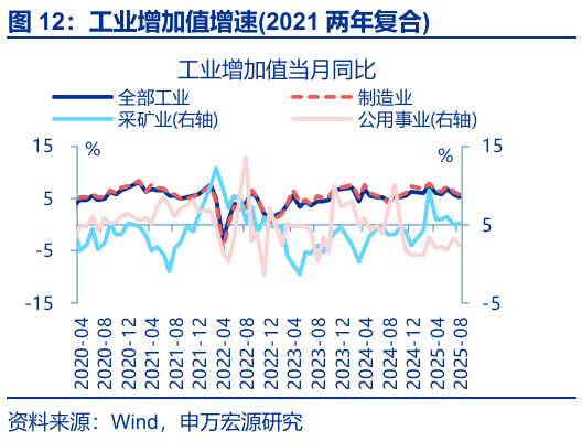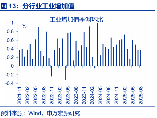 生產:上游生產持續向好,但“反內卷”對中下游生產的影響開始顯現。8月,工業增加值當月同比回落0.5pct至5.2%。拆分結構看,上游生產表現較強,主因供給收縮的預期提振價格,使部分行業盈利與生產邊際改善,如有色壓延(+2.3pct至9.1%)、非金屬礦物(+1.1pct至0.5%)、煤炭採選(+0.9pct至5.1%)等;本輪“反內卷”更聚焦中下游,8月運輸設備(-1.7pct至12%)、金屬製品(-1.4pct至2.8%)、下游中酒飲料茶(-2.5pct至-2.4%)、食品(-1.8pct至2%)均有所下行;黑色壓延(-1.3pct至7.3%)、橡膠塑料(-1.3pct至3.5%)回落則更多反應投資明顯走弱的影響。