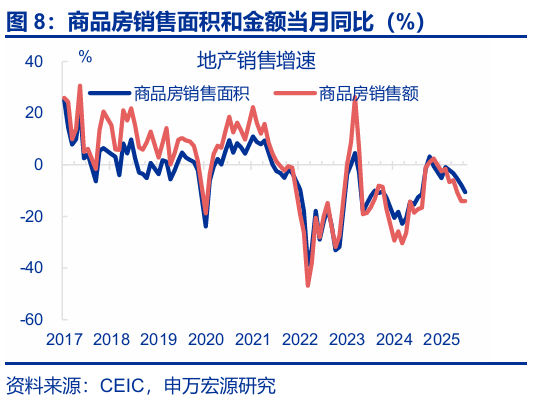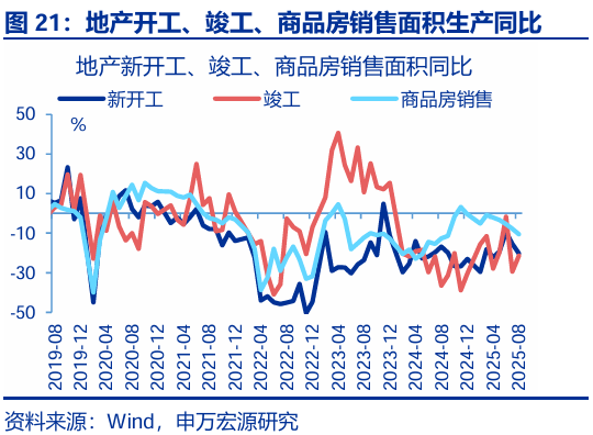 地產投資進一步下行,新開工、竣工面積延續低位。8月,房地產開發投資延續回落,累計同比較前月下行0.9pct至-12.9%,當月同比較前月下滑2.4pct至-19.4%。分不同階段看,新開工、竣工面積延續低位,當月同比分別較前月回落4.8pct至-20.3%、上行8pct至-21.4%;同時商品房銷售面積亦有回落,當月同比下滑2.7pct至-10.6%。