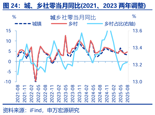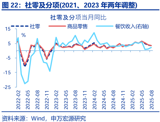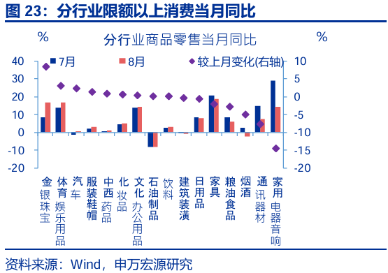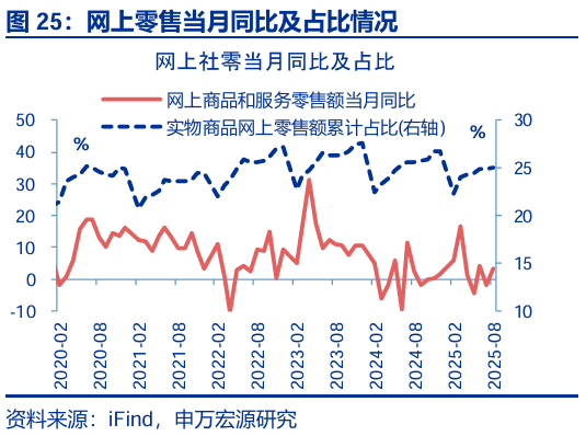 消費:部分“以舊換新”商品“退坡”特徵顯現,服務消費相對平穩。8月社會消費品零售總額同比增長3.4%,較前值下降0.3個百分點,其中限額以下商品零售和限額以上商品零售均有所回落。限額以上商品中,雖8月份最新一批國補資金下達,但前期受益於“以舊換新”最顯著的家電(-14.4pct至14.3%)和通信器材(-7.6pct至7.3%)增速在5月達到高點後仍趨於回落;汽車(+2.3pct至0.8%)小幅回暖,但增速維持在較低區間;必需品出現較明顯的回落,其中糧油食品(-2.8pct至5.8%)、菸酒(-5.0pct至-2.3%)回落幅度較大。服務消費方面,餐飲收入(+1.0pct至2.1%)小幅提振,1-8月服務零售額累計同比小幅下滑0.1個百分點至5.1%。