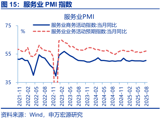 生產:工業生產走弱,服務業生產維持高位。8月,工業增加值當月同比較7月下行0.5pct至5.2%,其中製造業生產降幅較大。服務業生產指數當月同比下行0.2pct至5.6%。