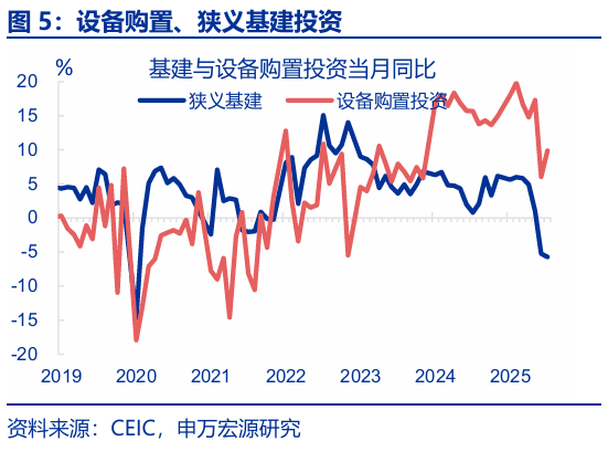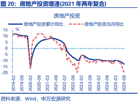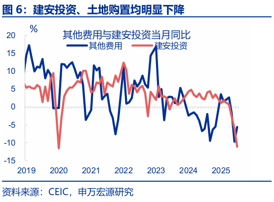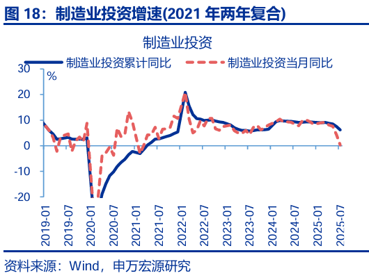 投資:8月固定投資繼續下行,主因“反內卷”對中下游投資影響開始顯現,疊加前期新開工持續收縮對當前地產投資的拖累加深。8月固定投資當月同比回落1.0pct至-6.3%;建安投資大幅下行(-5pct至-11.1%)構成主要拖累;分投資主體看,地產投資回落幅度最大(-2.4pct至-19.4%);製造業投資(-0.9pct至-1.2%)也明顯下行,主因中下游如運輸設備、汽車等行業大幅下滑;基建投資受公用事業拖累也出現明顯回落。