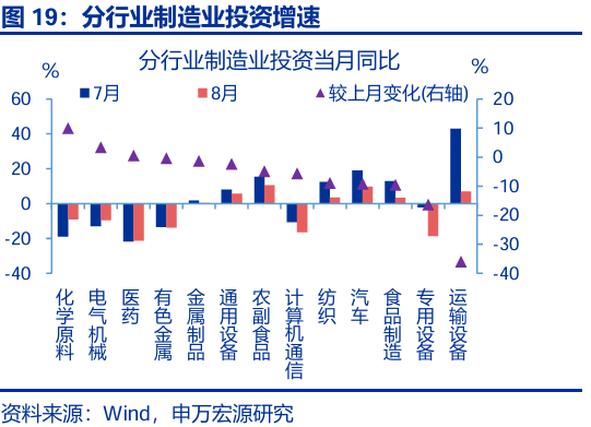 製造業投資降至四年來最低水平,裝備製造業投資降幅顯著。8月,製造業投資明顯回落,累計同比較上月下行1.1個百分點至5.1%;當月同比較上月回落0.9個百分點至-1.2%。分行業看,運輸設備、專用設備、汽車等行業投資增速降幅較大,分別較前月回落36、16.4、9.2個百分點至7%、-18.6%、9.7%;相比之下,化學原料、電氣機械等行業投資增速漲幅較大,分別較前月上行9.9、3.4個百分點至-9%、-9.5%。