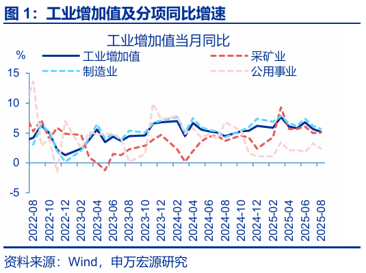 生產:工業生產走弱,服務業生產維持高位。8月,工業增加值當月同比較7月下行0.5pct至5.2%。其中製造業、公用事業生產增速回落,當月同比分別回落0.5pct至5.7%、回落0.9pct至2.4%,採礦業(+0.1pct至5.1%)則有回升。此外,服務業生產小幅回落,8月服務業生產指數當月同比較7月下行0.2pct至5.6%。