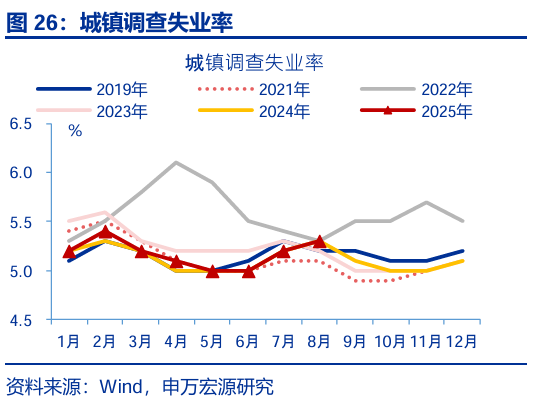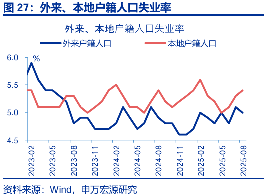 就業:城鎮調查失業率小幅回升,整體符合季節性。8月,城鎮調查失業率5.3%,較前月上行0.1pct,與過往6年均值持平。其中,本地戶籍(5.4%)人口失業率較前月回升0.1pct,外來戶籍(5.0%)較前月回落0.1pct。