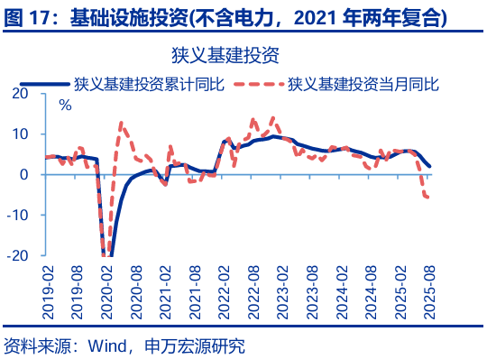 投資:固定資產投資進一步下探,狹義基建投資延續負增。8月,固定資產投資累計同比回落1.1個百分點至0.5%、不及市場預期(1.3%,WIND),調整後的固定資產投資當月同比爲-6.3%、較7月回落1個百分點;其中,狹義基建投資當月同比較7月回落0.5個百分點至-5.8%。