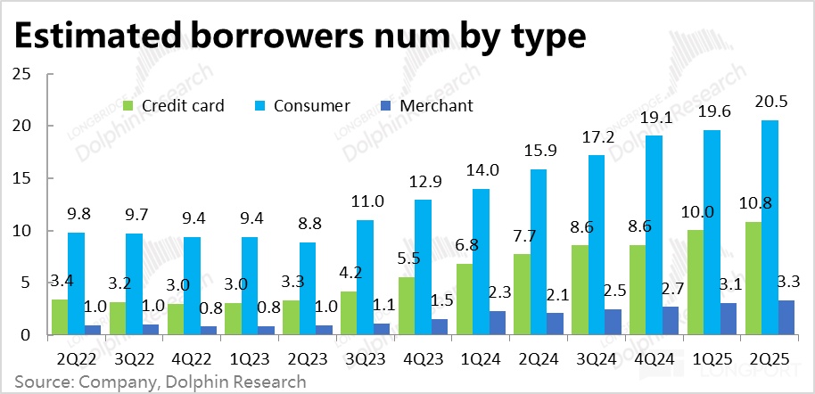 a. 消費貸的用戶體量最大,在2Q25已達2050萬人,佔到公司季度活躍電商買家數量的約1/3。不過,這也因爲消費貸款中近一半是消費者在線上平臺內購物使用的先買後付功能。