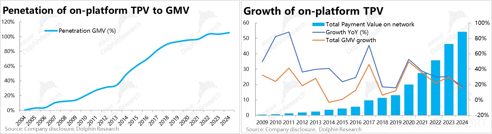 根據披露,自2003年支付功能上線,至2022年平臺內支付額佔成交額的滲透率已達100%以上(GMV指標不包括非電商業務的成交額,因此GTV/GMV會超過100%)。增速上,也可見2020年開始體系內GTV的增速已基本和GMV增速趨於一致。