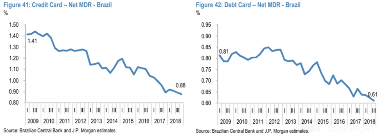 支付行業實際普遍呈現隨着市場和公司越發成熟,行業和公司的淨變現率逐步走低的現象。根據巴西中央銀行披露的數據,在2009年到2018年間,以信用卡支付淨變現率從1.4%下降到0.88%(53bps),以借記卡支付情況下也走低了20bps。