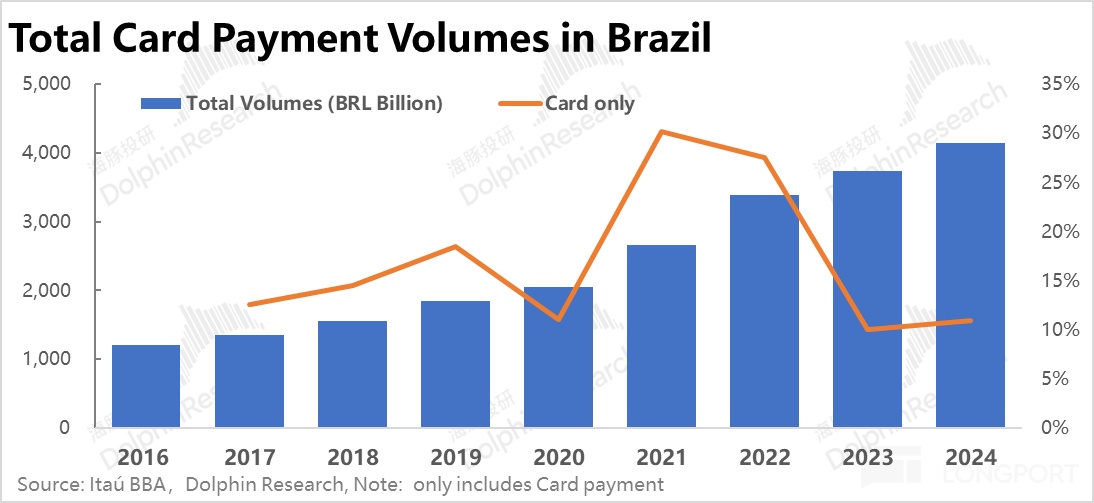 行業體量上,僅考慮刷卡支付,巴西支付市場的整體規模略超4.1萬億巴西里拉,對應近$7600億。走出疫情後的高速增長期後,近兩年刷卡支付額的整體增速回落到約10%左右。