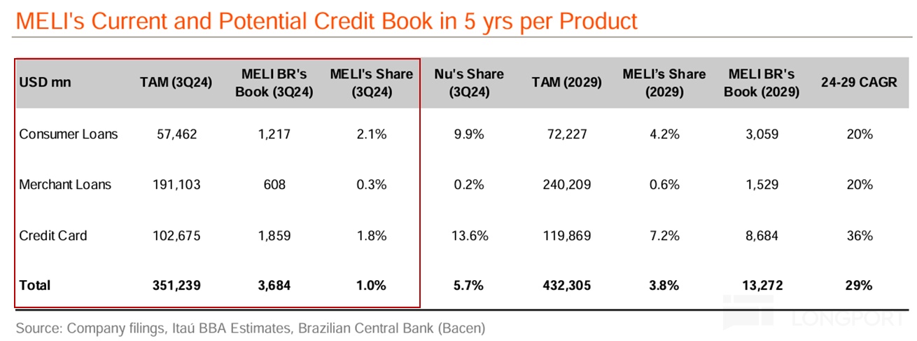 從市佔率和行業規模上,根據某巴西本地券商的測算,單看巴西這一國市場,在24年底Meli各細分類別的貸款規模佔對應類別貸款總市場規模的比重都僅爲低個位數%,各個類別合計加總後Meli的市場份額也僅1%。