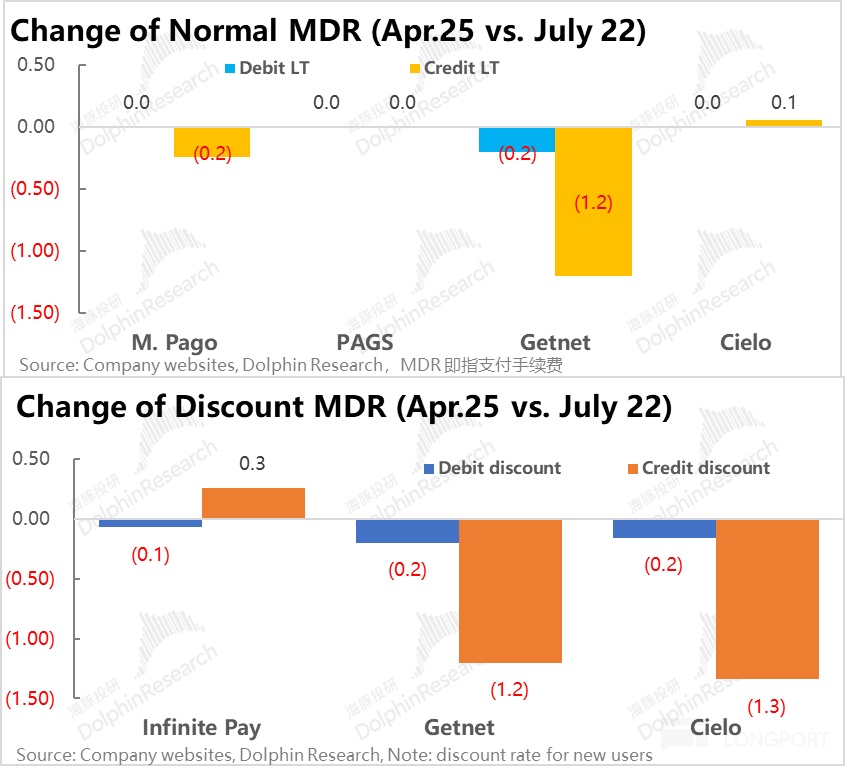 18年之後至今,雖然海豚沒有看到類似的行業數據,但根據各主要收單公司公佈的費率對比,多數情況下2025年的費率相比2022年還是走低的。整體上支付手續費率仍保持着下行趨勢,但下行的幅度有所趨緩。