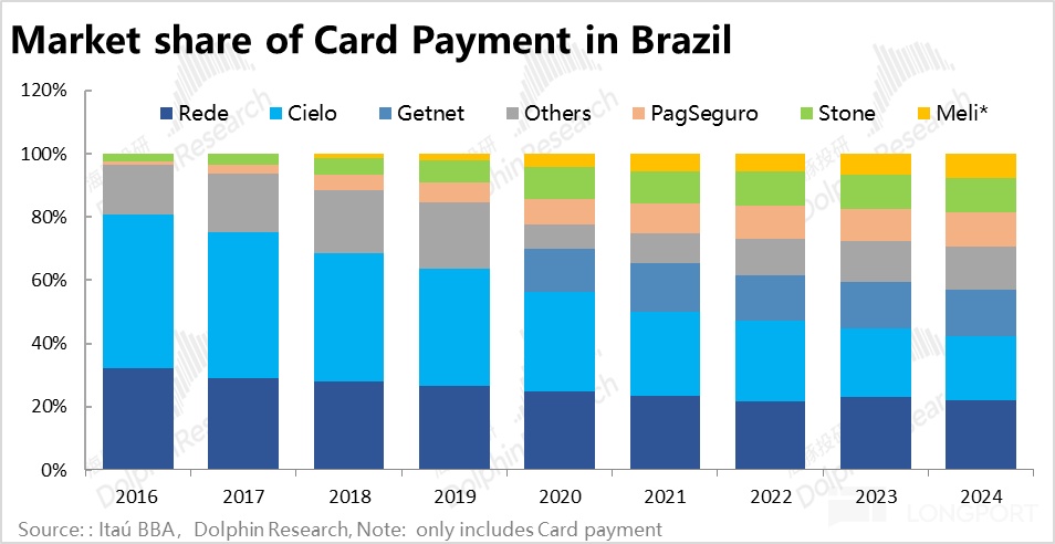 競爭格局上,目前巴西支付行業內,有5個主要的支付收單商,可以大致區分爲兩類:a. 第一類是由傳統金融機構控制的收單商,包括Cielo,Rede和Getnet,他們背後的主要投資/控制人都是巴西頭部的大銀行;b. 第二類無金融背景,跨界進入支付的Fintech型支付收單商,包括Meli旗下的Pago,以及PagBank 和 Stone。