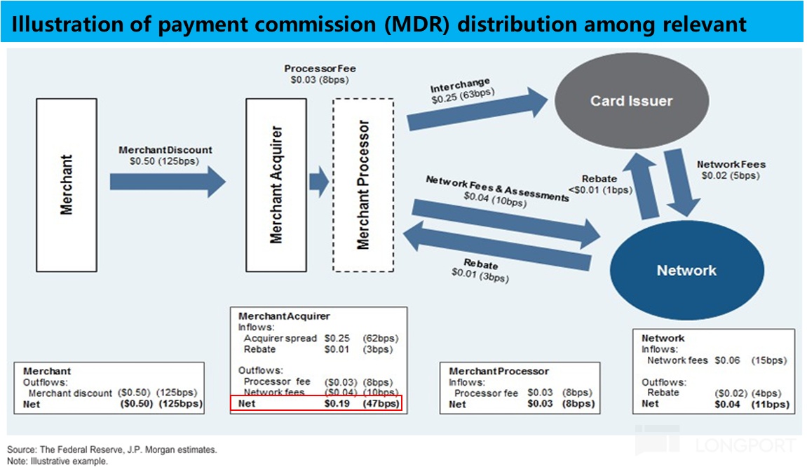 而支付產業鏈的變現途徑簡單來說,即基於支付額向商戶收取一定比例的手續費率(術語稱爲MDR,Merchant Discount Rate)。以公式的形式,“支付服務收入 = 支付額 * 手續費率”,而這可以視爲支付產業的 “第一性原理”,即在支付行業內想獲取更多的收益,要麼覆蓋更多的商家/場景以處理更多的支付金額,要麼儘量提高自身能佔有的費率。