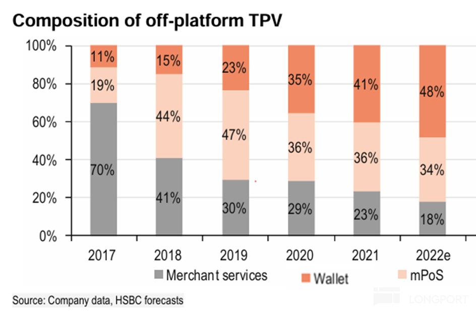 根據公司早年間的披露並結合賣方的預測,線下支付(mPOS)和數字錢包自推出後,在體系外支付額中的比重快速上升,從2017年的合計30%到2022年的超80%。而體系外線上支付的比重連年下滑,重要性相對較低。