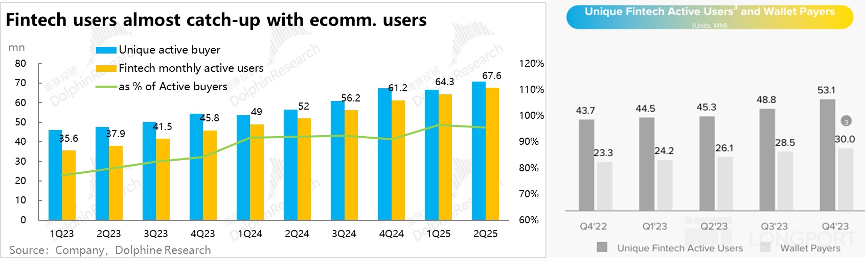 根據公司的披露,截至2Q25公司金融業務的月活用戶已達近6800萬,已達其電商業務季度活躍用戶體量的95%以上。其中按公司在4Q23的最後一次披露,公司的數字錢包用戶規模爲3000萬,佔當時整體金融業務月活的近57%。