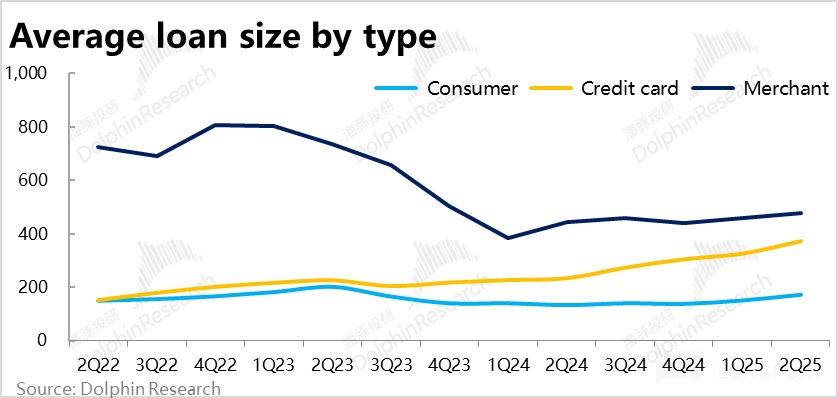 b. 雖然信用卡用戶的體量仍只有消費貸的一半,但信用卡貸款用戶的增長更快,2Q22到2Q25三年間用戶規模增長了約2x,而消費貸用戶則只增長了1x。再疊加信用卡的平均貸款規模同期也增長了約1.4x,而消費貸平均規模變化不大,因此信用卡貸款的體量因此反超了消費貸。