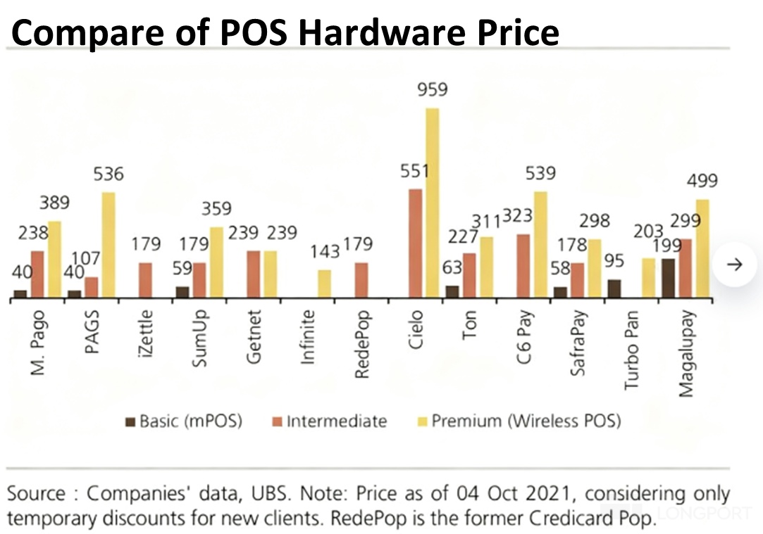 大邏輯上,Fintech公司能夠快速搶佔份額的主要原因,是老生常談的傳統金融機構對小微商戶的覆蓋和服務意願較低,並且傳統機構較高的POS機等硬件價格也限制了小微商戶們採用這些服務。而Pago和PagS等新興支付結構的入門款POS機價格僅BRL40,遠低於傳統POS機至少BRL 200以上的價格,大幅降低商戶使用POS服務的入門成本。對此我們不詳細討論。