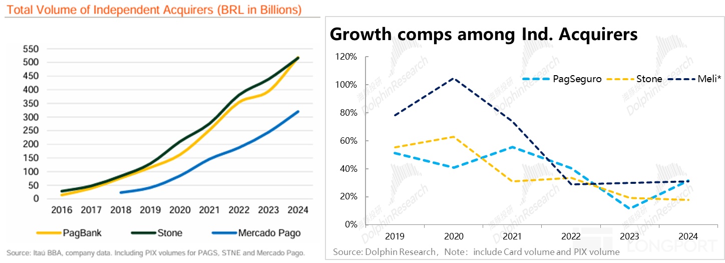但是也能看到,在上述三家新興支付公司內部,Meli旗下的Pago的份額目前是最低的。根據外資行的測算,2024年Mercado Pago在巴西市場的支付規模大約是PagS和Stone規模的60%。且上述Mercado Pago的支付額中約40%是來自體系內的,因此若只看體系外支付的體量,Pago大約只有同行體量的不足40%。