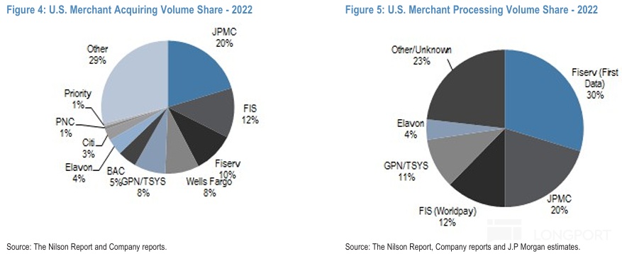 以美國市場作爲驗證,收單行業的市佔率是相當分散的,門檻相對較低(只要能招攬到商戶就行)。相比之下中臺的支付處理市場則相當集中,前兩大玩家就佔據越一半的份額。因此,多數情況下支付收單方相比其上游的議價能力是弱勢方。