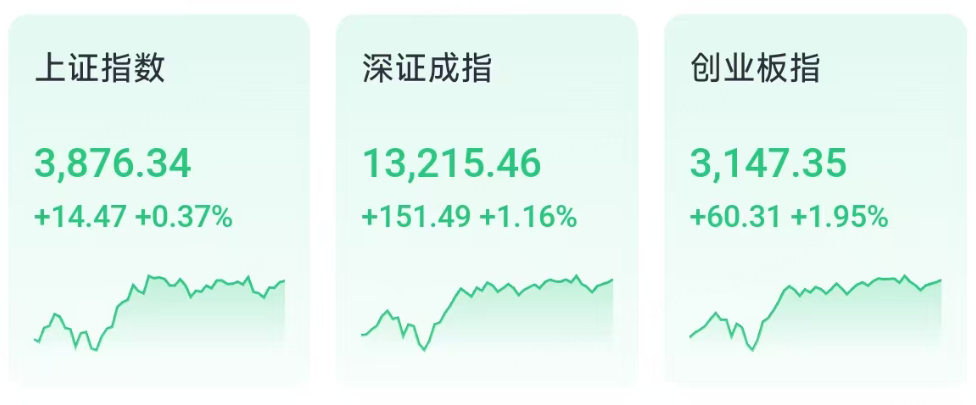 今日市場震盪走高,創業板指漲幅領先,權重股寧德時代再創新高。截至收盤,滬指漲0.37%報3876.34點,深成指漲1.16%報13215.46點,創業板指上漲1.95%報3147.35點。