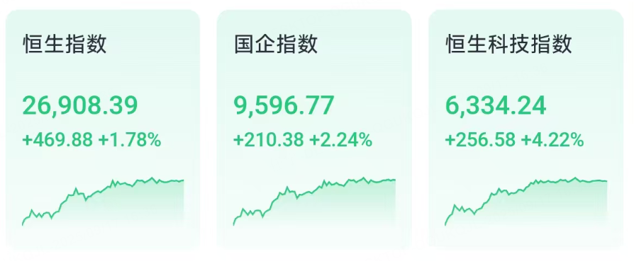 9月17日週三,港股三大指數全天呈單邊上漲行情,市場做多情緒高漲。在權重科技股的助力下, 恒生科技指數 大幅收漲4.22%,恒生指數漲1.78%逼近27000點大關,國企指數漲2.24%,三者均刷新階段高位。