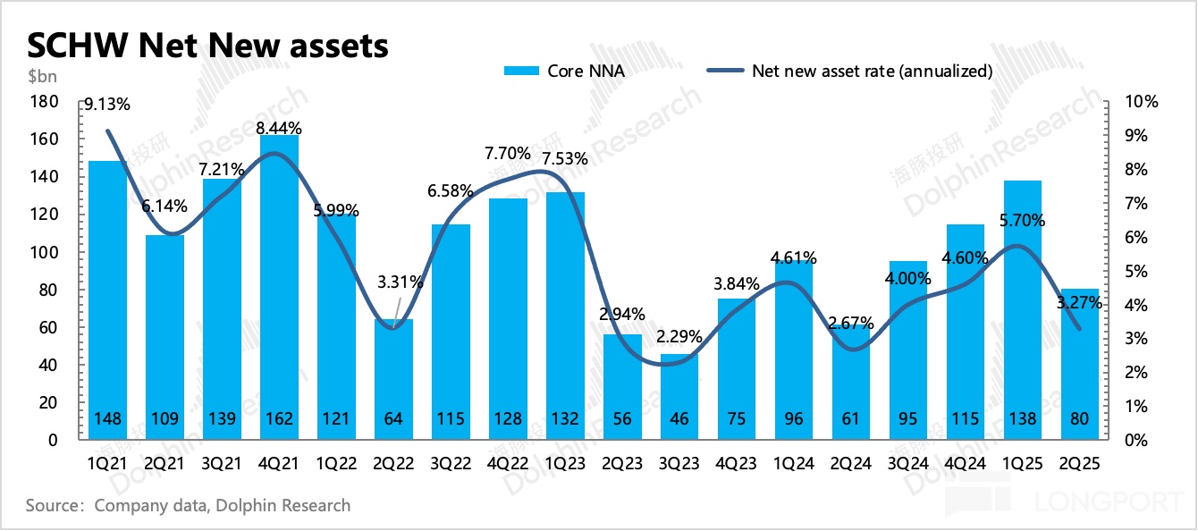 在發展過程中,“客戶資產規模”是嘉信追求的核心KPI。哪怕在今天,資產淨增加(Net New Assets)仍然是管理層首要關注的經營指標。其本質上遵循的是在金融行業的競爭紅海下,規模經濟的內在發展趨勢。