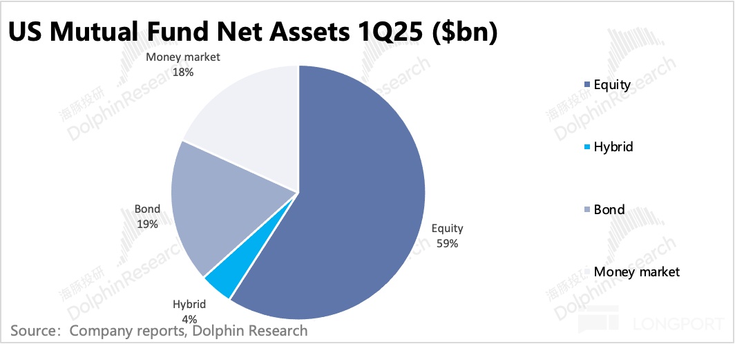 截至2024年末,美國共同基金達到39萬億美元規模(包含FOF則爲42萬億),是全民財富的26%,在居民金融資產中佔比30%。全行業存續基金10678只(包含ETFs),共同基金以股票基金爲主,佔了近60%。