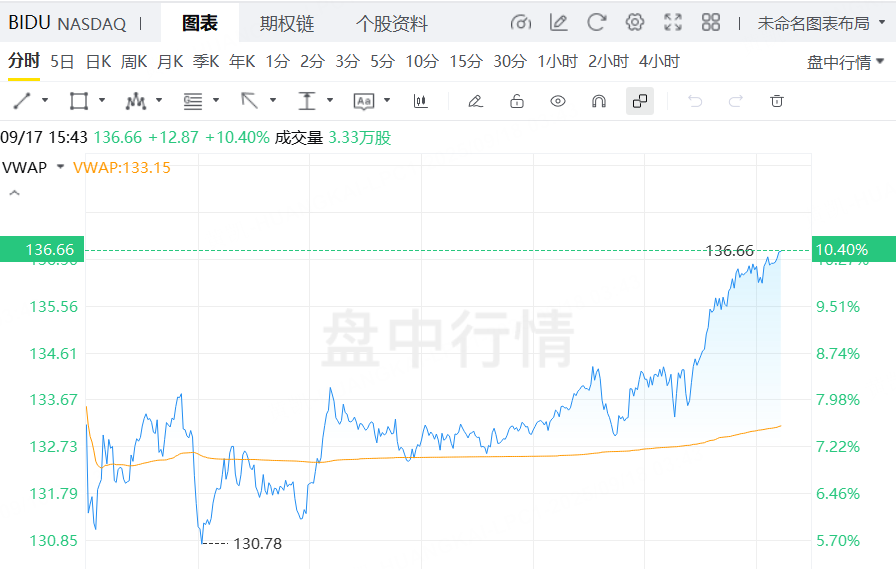 熱門中概股方面:百度漲超10%,萬國數據漲超8%,金山雲漲超6%,拼多多、蔚來漲近5%。