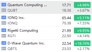 9月18日(週四)美股夜盤,量子計算概念股延續隔夜漲勢, IonQ Inc 漲超7%, Rigetti Computing漲超4%,Quantum漲超3%, D-Wave漲超2%。