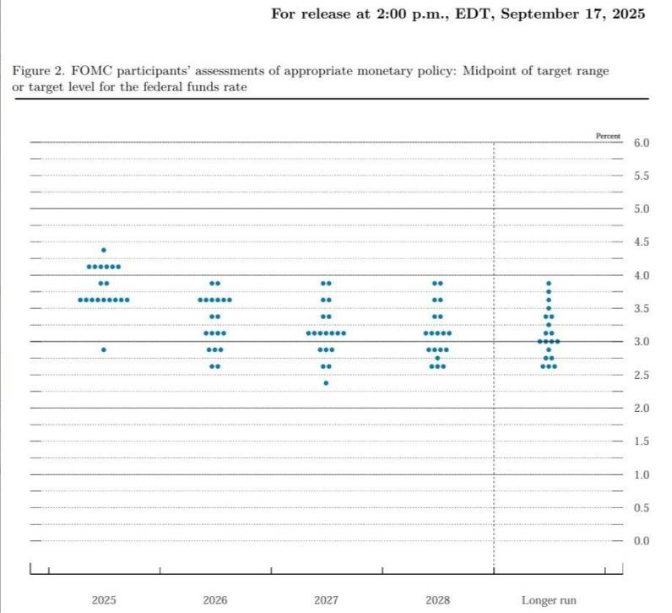 另外,點陣圖顯示,2025、2026、2027年底和長期聯邦基金利率預期中值分別爲3.6%、3.4%、3.1%、3.0%(6月預期爲3.9%、3.6%、3.4%、3.0%),2028年底聯邦基金利率預期中值爲3.1%。長期聯邦基金利率預期中值爲3.0%(6月預期爲3.0%)。