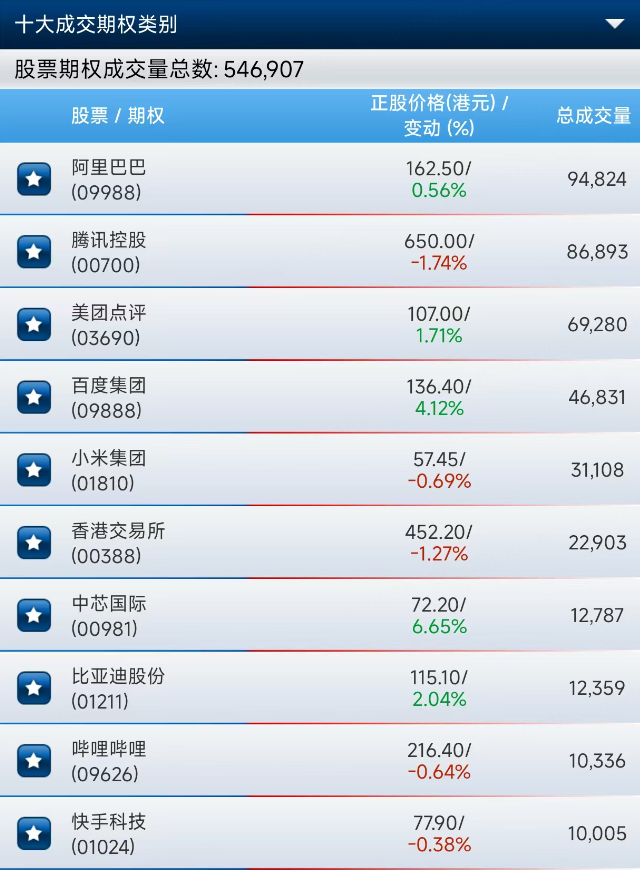 港股期權半日成交546907張。其中,阿里巴巴成交量位於榜首,期權成交94824張。騰訊、美團、百度、小米緊隨其後。