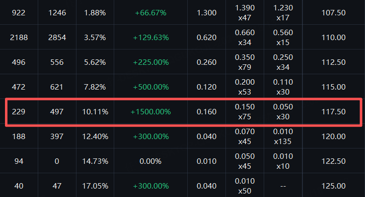 美團CALL的價格漲勢依然比較迅猛。一份週五到期的合約,行權價117.5港元,價格飆升1500%,標記價升幅也達850%。