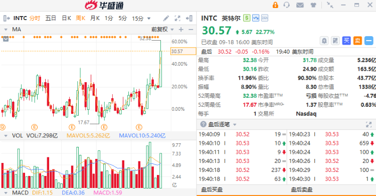 美股芯片股全線大漲,截至週四收盤,費城半導體指數大漲3.6%,英特爾暴漲超22%,創1987年10月以來最大盤中漲幅;阿斯麥ADR、應用材料大漲超6%,科磊、美光科技漲超5%,邁威爾科技、安森美半導體漲超4%,臺積電ADR、恩智浦漲超2%。