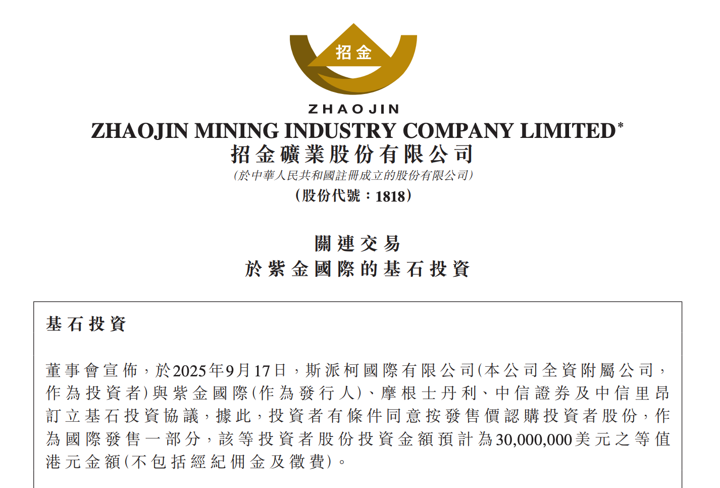 招金礦業公佈,全資附屬公司斯派柯國際與紫金黃金國際訂立基石投資協議,將有條件同意按發售價認購紫金黃金國際股份,作爲國際發售一部分,投資金額預計爲3000萬美元之等值港元金額(不包括經紀佣金及徵費)。