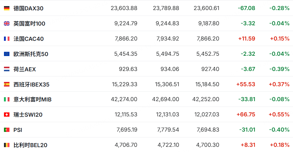 歐洲主要股指跌多漲少,德國DAX30跌0.28%,法國CAC40漲0.15%。