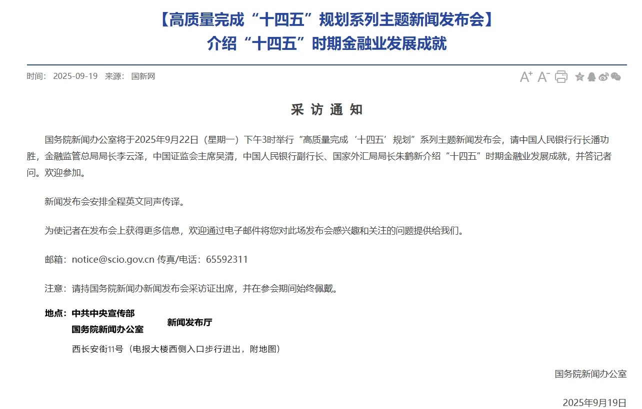 國務院新聞辦公室將於2025年9月22日(星期一)下午3時舉行“高質量完成‘十四五’規劃”系列主題新聞發佈會,請中國人民銀行行長潘功勝,金融監管總局局長李雲澤,中國證監會主席吳清,中國人民銀行副行長、國家外匯局局長朱鶴新介紹“十四五”時期金融業發展成就,並答記者問。