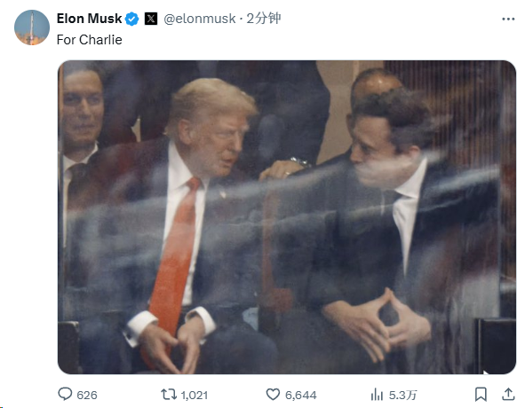 當地時間21日,特朗普與特斯拉首席執行官馬斯克共同出席悼念查理·柯克的活動,期間馬斯克坐在了特朗普的鄰座,雙方進行了簡短交流並握手,隨後馬斯克離座,特朗普還友好的拍了拍馬斯克。值得一提的是,“特馬”在6月份公開決裂之後,柯克曾努力幫助兩人和解。馬斯克在社交媒體平臺“X”上發佈自己與美國總統特朗普同框交談的圖片,並表示:“爲了查理”(For Charlie)。