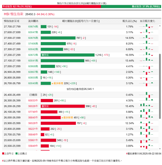 過去5日,恒指牛證合計約1.09億港元資金淨流出套現;恒指熊證則合計約1.92億港元資金淨流入。街貨分佈方面,至上週五,恒指牛證街貨佔比約62.1%,分佈在收回價25900點至26500點之間,累計相當約2936張期指合約;恒指熊證街貨在收回價26700點至27300點之間,累計相當約2920張期指合約。