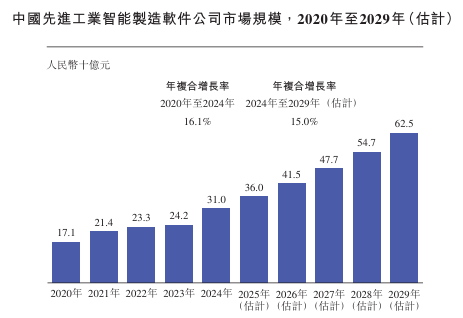 根據灼識諮詢的資料,中國先進工業智能製造軟件公司的市場規模從2020年的人民幣171億元增長至2024年的人民幣310億元,年複合增長率爲16.1%,並預計將在2029年達到人民幣625億元,年複合增長率爲15.0%。