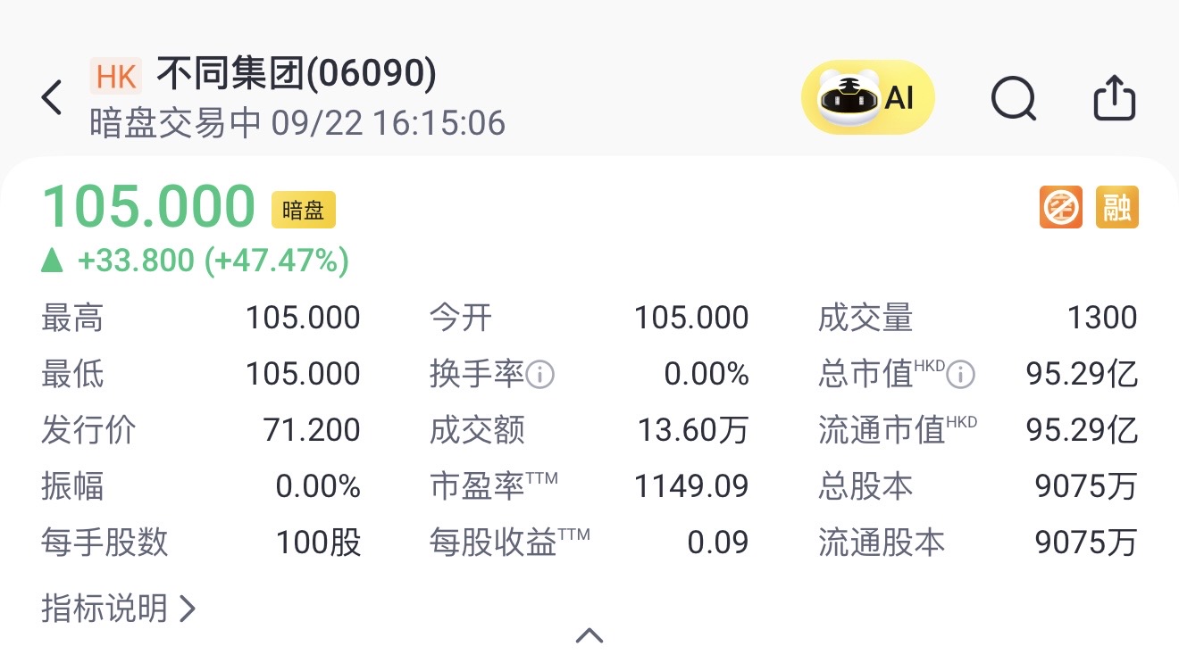 9月22日(週一),不同集團開啓暗盤交易,截至發稿報105港元,漲幅47%,每手賺3380港元,總市值95.3億。