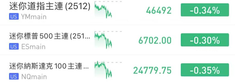 美股三大指數期貨盤前走低,納指期貨 $NQmain 跌0.35%,標普500期貨 $ESmain 跌0.30%,道指期貨 $YMmain 跌0.34%。