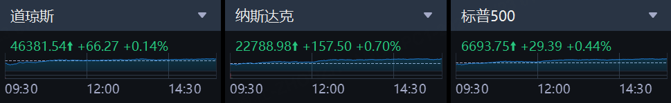 美東時間週一,美股市場低開高走,在英偉達和蘋果的帶領下,三大股指盤中均創歷史新高,並收於紀錄高位。截至收盤,道瓊斯指數漲0.14%,報46381.54點;標普500指數漲0.44%,報6693.75點;納斯達克指數漲0.70%,報22788.98點。