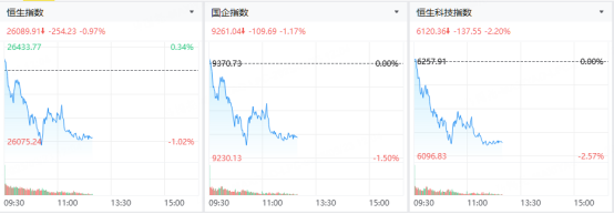 9月23日,三大指數高開低走,市場連續回調。截止午盤,恒生指數跌0.97%險守26000點關口,國企指數跌1.17%,恒生科技指數跌幅最大,午間收跌2.2%。