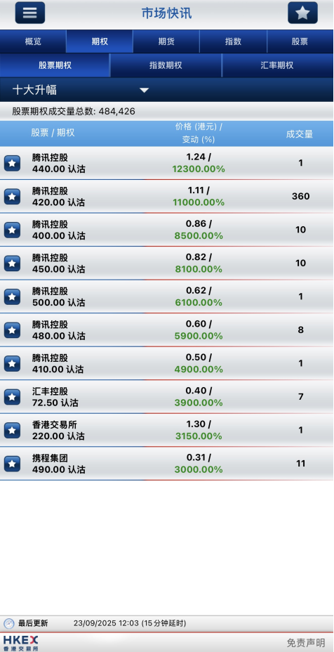 騰訊控股早盤跌0.94%,滙豐控股早盤漲0.75%,攜程集團早盤跌0.5%,從十大升幅榜單中發現,今日升幅榜單中認沽期權佔據榜單全部席位,騰訊控股440港元的認沽期權漲幅最高達12300%。